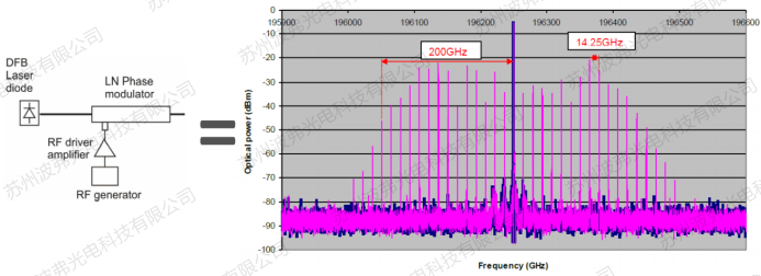舉例如下圖,射頻信號(hào)頻率為14.25GHz, 根據(jù)驅(qū)動(dòng)電壓強(qiáng)度大小,可以產(chǎn)生10多階邊帶,將載波光譜展寬至400GHz數(shù)量級(jí)。