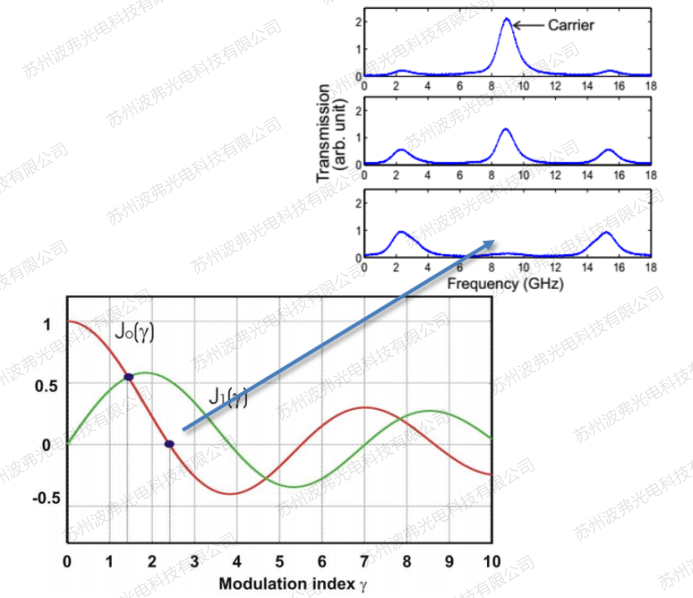 貝塞爾函數(shù)模擬計(jì)算如下圖所示,當(dāng)調(diào)制深度(modulation index)γ=2.4的時(shí)候,載波(紅線(xiàn))強(qiáng)度為零,調(diào)制深度定義為: