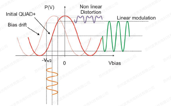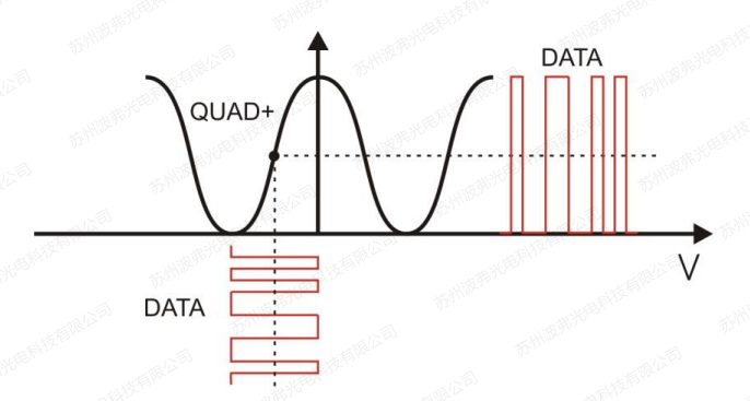 鈮酸鋰(LiNbO3)M-Z強(qiáng)度調(diào)制器是自誕生以來(lái)得到了廣泛的應(yīng)用,主要應(yīng)用于光網(wǎng)絡(luò)1310nm和1550nm波段,1064nm近紅外激光器波段,以及800nm-900nm原子物理波段。M-Z電光強(qiáng)度調(diào)制器是干涉型器件,具有正弦傳輸特性函數(shù)(下圖黑色曲線),在強(qiáng)度調(diào)制器上施加適當(dāng)?shù)钠珘褐?,使調(diào)制器工作在合適的工作點(diǎn)(下圖QUAD+),可以實(shí)現(xiàn)高速的電信號(hào)-光信號(hào)轉(zhuǎn)換(下圖紅色曲線)。雖然鈮酸鋰器件已經(jīng)相對(duì)成熟,非常穩(wěn)定,但它們的工作點(diǎn)任然會(huì)受到外部條件的變化而產(chǎn)生的緩慢的漂移(請(qǐng)參考iXblue偏壓控制器產(chǎn)品介紹)。為了獨(dú)立調(diào)整M-Z電光調(diào)制器的工作點(diǎn)并應(yīng)用高頻調(diào)制信號(hào),人們?cè)O(shè)計(jì)了兩組電極:一組電極即射頻電極,用于施加射頻信號(hào)(NRZ, PRBS等數(shù)字信號(hào),模擬信號(hào),脈沖信號(hào)等)。第二組電極,直流偏壓電極,用來(lái)調(diào)節(jié)調(diào)制器的工作點(diǎn)。