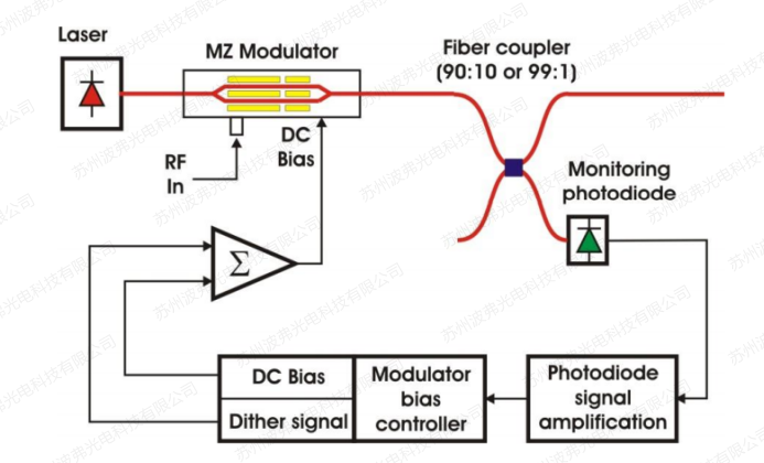 為了調(diào)節(jié)并保持調(diào)制器輸出狀態(tài),監(jiān)控并補(bǔ)償直流偏壓的變化,我們需要從輸出的光信號(hào)中采樣一小部分(通常1%或10%),把它接入監(jiān)控光電二極管(PD),再通過(guò)偏壓控制器的反饋電路進(jìn)行控制。在這方面,通常有兩種方法可以獲得來(lái)自鈮酸鋰波導(dǎo)調(diào)制器的監(jiān)控光信號(hào)。第一種方法在調(diào)制器輸出端口外接一個(gè)耦合器,以及提取一部分調(diào)制信號(hào)作為監(jiān)視信號(hào),盡管最終輸出的使用功率根據(jù)耦合器的性能略有損失。另一個(gè)方法是在調(diào)制器內(nèi)部集成一個(gè)PD,用于測(cè)量波導(dǎo)和耦合處的雜散光,這樣的好處是不引起主輸出信號(hào)的任何額外損耗。