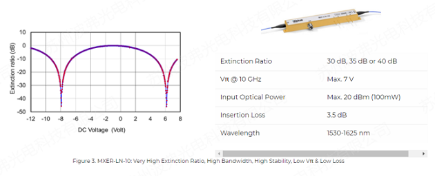 泵浦脈沖的消光比直接影響整個(gè)BOTDA測(cè)量系統(tǒng)的信噪比。因此,高消光比EOM直接影響B(tài)OTDA系統(tǒng)的最大測(cè)量范圍和測(cè)量速度。MXER-LN系列強(qiáng)度調(diào)制器是高性能調(diào)制器,具有優(yōu)越的消光比。該產(chǎn)品的設(shè)計(jì)依賴于iXblue的“Magic Junction”(專利號(hào)n° US2008193077)。MXER-LN系列強(qiáng)度調(diào)制器是BOTDA應(yīng)用中需要高消光和高帶寬組合的關(guān)鍵器件。