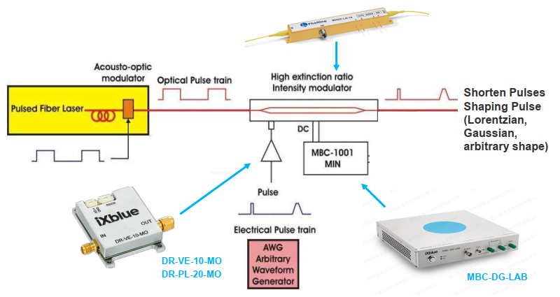 脈沖整形應(yīng)用,其方案如上圖所示,以脈沖激光器產(chǎn)生的脈沖激光為載波,信號(hào)發(fā)生器產(chǎn)生電脈沖,經(jīng)由射頻放大器(DR-VE系列)進(jìn)行放大,加載到高消光比強(qiáng)度調(diào)制器(MXER-LN系列)中,經(jīng)過(guò)電光轉(zhuǎn)化,電脈沖信號(hào)成功加載到載波光信號(hào)之上,從而達(dá)到脈沖整形的目的。
