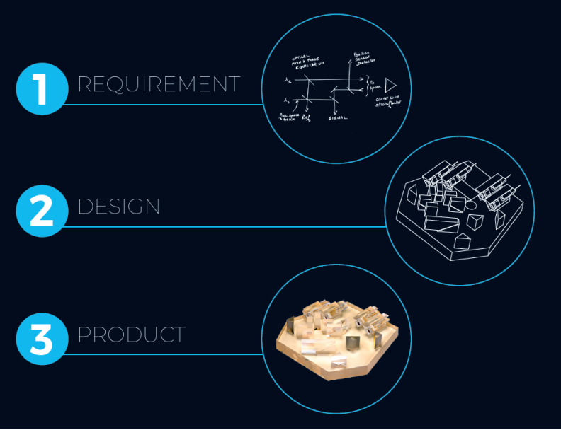 iXblue能夠?qū)?shí)驗(yàn)裝置集成為工業(yè)級(jí)的光學(xué)模塊,從客戶要求(簡(jiǎn)易的草圖,下圖步驟1)開(kāi)始,iXblue可以領(lǐng)導(dǎo)或參與完整的產(chǎn)品開(kāi)發(fā)步驟:設(shè)計(jì)(下圖步驟2)、原型機(jī)到批量生產(chǎn)(下圖步驟3),iXblue的專業(yè)技術(shù)在于將微光學(xué)元件超精確地組裝在玻璃基板上,在滿足光學(xué)性能要求的前提下提供更小的體積,優(yōu)異的可靠性和穩(wěn)定性。