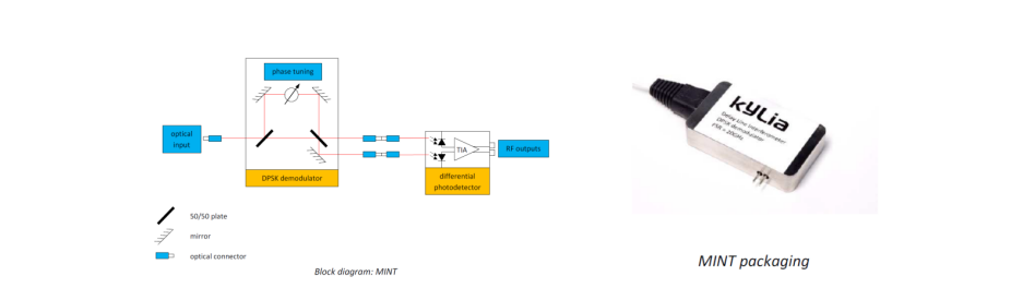 當(dāng)對(duì)傳輸速率的需求高于Gbit/s時(shí),必須開(kāi)發(fā)新的調(diào)制和解調(diào)技術(shù)。基于自由空間設(shè)計(jì)和長(zhǎng)期的電信技術(shù)背景,iXblue能夠?yàn)檫@種復(fù)雜的解調(diào)提供各種產(chǎn)品。其中一系列產(chǎn)品(iXblue MICS系列(超鏈接),請(qǐng)聯(lián)系我們提供更多資料)致力于多路復(fù)用和解復(fù)用,這意味著能夠在一根獨(dú)特的光纖中傳輸許多不同波長(zhǎng)的激光(即40路不同波長(zhǎng)的激光束在一根典型的電信光纖中傳輸,1528至1560 nm,C波段,)。另一系列產(chǎn)品(iXblue MINT系列,見(jiàn)下圖)使用光的另一個(gè)特性進(jìn)行解調(diào),即電磁波的相位,相位(0或π)的調(diào)制比強(qiáng)度的調(diào)制更容易、更快。MINT產(chǎn)品使光學(xué)DPSK(差分相移鍵控)解調(diào)成為可能,它適用于大約10 Gbit/s的更高傳輸速率。(MINT:延遲線干涉儀,DPSK解調(diào)器)