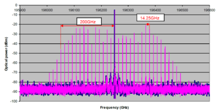 基于鈮酸鋰電光調(diào)制器所產(chǎn)生的光學(xué)頻率梳,原理是通過鈮酸鋰相位調(diào)制器(Phase Modulator),鈮酸鋰強(qiáng)度調(diào)制器(Intensity Modulator)的邊帶產(chǎn)生(參考微信公眾號(hào):使用電光調(diào)制器實(shí)現(xiàn)邊帶調(diào)制),通過串聯(lián)鈮酸鋰相位調(diào)制器、強(qiáng)度調(diào)制器實(shí)現(xiàn)高平坦度(~2dB),多梳線光學(xué)頻率梳產(chǎn)生,最終產(chǎn)生上百個(gè)梳線的頻率梳。基于鈮酸鋰調(diào)制器產(chǎn)生的光學(xué)頻率梳具有中心頻率已于調(diào)節(jié),重復(fù)頻率可控等優(yōu)勢。