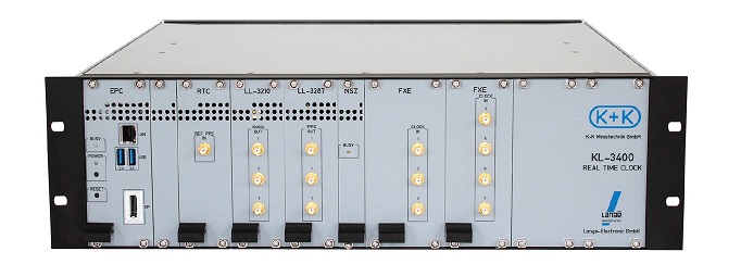 K+K KL-3400實(shí)時(shí)時(shí)鐘的硬件由幾個(gè)板組成,每個(gè)板都有一個(gè)前面板??蛇x的附加信號(hào)發(fā)生器(如5MHz或100MHz)、分配放大器等完成了畫面。