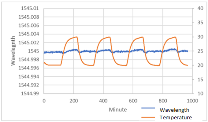 環(huán)境溫度在10°C范圍內(nèi)循環(huán)時(shí),范圍內(nèi)任何位置的一般波長(zhǎng)的波長(zhǎng)與時(shí)間的關(guān)系??偲菩∮?pm。ClarityPlus可以為C波段的任何波長(zhǎng)生成可追溯到NIST的波長(zhǎng)。