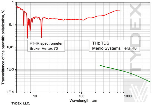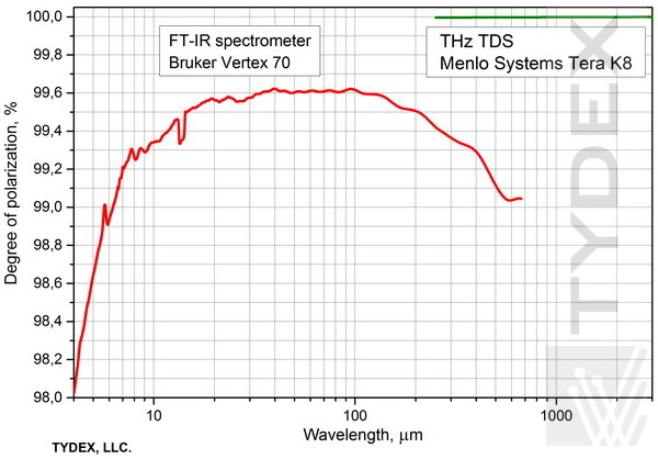 上面的曲線清楚地表明我們的偏振器在非常寬的波長范圍內(nèi)具有出色的質(zhì)量。 請注意,實際測量結果可能與上面給出的值不同,具體取決于光譜儀類型和測量模式。