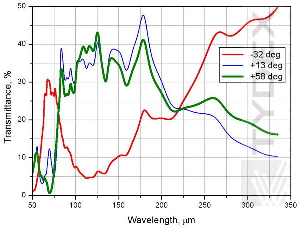 2. TWPC作為150-300μm范圍內(nèi)任意波長(zhǎng)的四分之一波長(zhǎng)單色板。TWPC操作在220 μm的四分之一波片模式下進(jìn)行了測(cè)試。 圖2顯示了在下游偏振器的不同方向上計(jì)算和測(cè)量的TWPC透射光譜的比較。