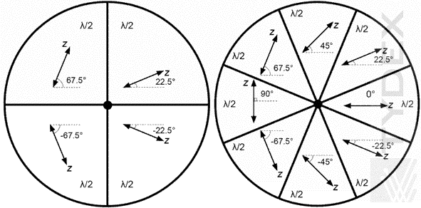 由幾個特殊定向的半波片組成的分段波片允許從線性偏振的輻射獲得徑向和方位角偏振的輻射。 這種波片的工作原理如下所示。