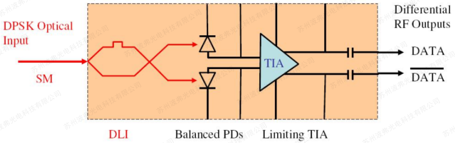 集成的DPSK接收器將延遲線干涉儀(DLI)與平衡接收器相結(jié)合,以在蝶形封裝中實現(xiàn)緊湊的尺寸。與分立元件相比,集成接收器將來自DLI的光輸出直接耦合到平衡光電探測器,除了消除光纖路由和匹配之外,還可以減少插入損耗和低通道偏移。