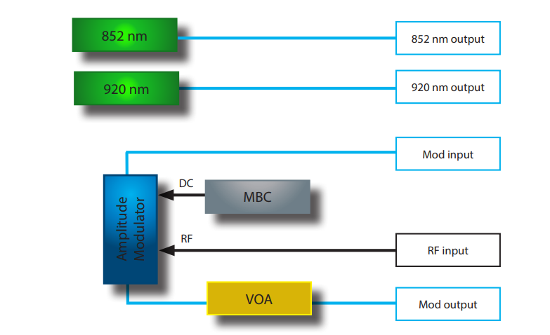 ? 內(nèi)嵌兩個(gè)激光源,一個(gè)852 nm和920 nm低RIN DBR激光器。為了便于使用,省略了一根外部接插線(xiàn),將激光輸出連接到調(diào)制器輸入光端口。波長(zhǎng)和功率可通過(guò)前面板控制或ModBox軟件接口進(jìn)行調(diào)整。