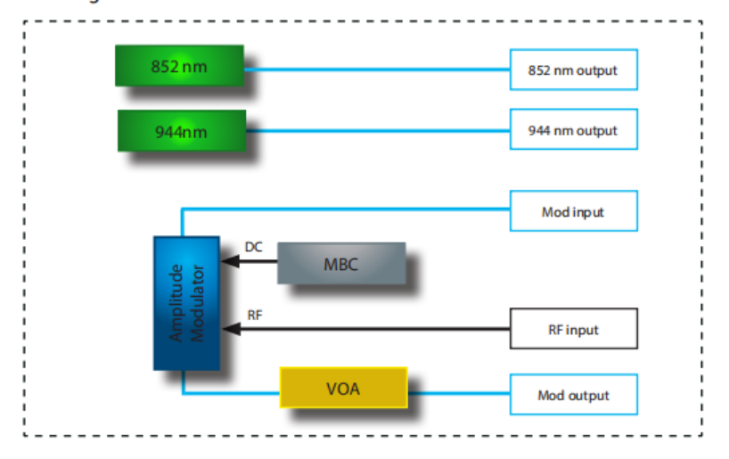 ? 內(nèi)嵌兩個激光源,一個852 nm和944 nm低RIN DBR激光器。為了便于使用,省略了一根外部接插線,將激光輸出連接到調(diào)制器輸入光端口。波長和功率可通過前面板控制或ModBox軟件接口進行調(diào)整。