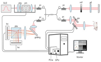 光學(xué)相干層析成像(Optical Coherence tomography)技術(shù)是一種非侵入(無損)、非接觸微米級(jí)分辨率的成像技術(shù),利用光學(xué)相干門來獲得組織內(nèi)部的層析結(jié)構(gòu)。譜域OCT(Spectral domain OCT, SD-OCT)是第二代OCT技術(shù),相比傳統(tǒng)的第一代時(shí)域OCT技術(shù),在成像速度、信噪比和靈敏度等方面具有明顯優(yōu)勢,在眼科成像、功能成像、生物醫(yī)療等領(lǐng)域發(fā)揮了重要作用。