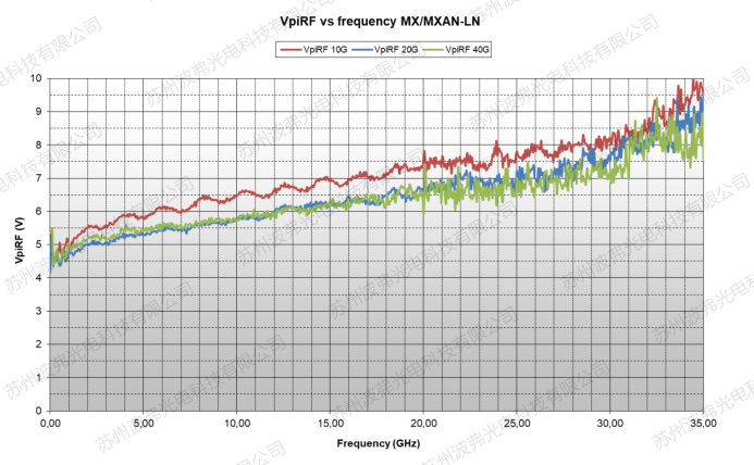 這是因?yàn)楸M管與材料無(wú)關(guān),但是設(shè)計(jì)和生產(chǎn)方面,任何射頻電子零部件,隨著頻率的升高都會(huì)有射頻的衰減,其功率從最高點(diǎn)下降到1/2的位置對(duì)應(yīng)的頻率,我們稱(chēng)為-3dB帶寬(請(qǐng)參考微信文章“iXblue電光調(diào)制器常見(jiàn)參數(shù)定義”)。雖然材料本身的參數(shù)并不隨頻率升高而變化,但是波導(dǎo)的電極等射頻部分不可避免的存在高頻衰減,因此調(diào)制器的射頻半波電壓Vp RF隨著頻率的升高而升高。
