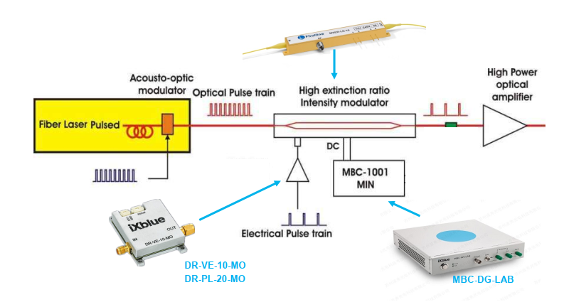 脈沖整形應(yīng)用,其方案如上圖所示,以脈沖激光器產(chǎn)生的脈沖激光為載波,信號(hào)發(fā)生器產(chǎn)生電脈沖,經(jīng)由射頻放大器(DR-VE系列)進(jìn)行放大,加載到高消光比強(qiáng)度調(diào)制器(MXER-LN系列)中,經(jīng)過(guò)電光轉(zhuǎn)化,電脈沖信號(hào)成功加載到載波光信號(hào)之上,從而達(dá)到脈沖整形的目的。