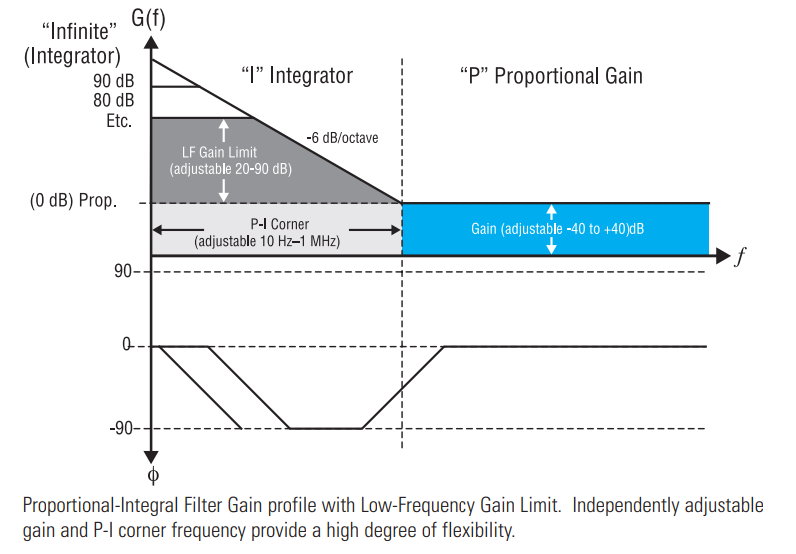 LB1005伺服控制器由模擬電子處理的三個階段組成:輸入階段、濾波器階段和輸出階段。 (圖2)過濾階段是最重要的,因?yàn)樗O(shè)置系統(tǒng)的行為。 用戶控制影響系統(tǒng)穩(wěn)定性的三個重要濾波器參數(shù),以及實(shí)際輸出與所需值的匹配程度(P-I角、比例增益和低頻增益限制)。
