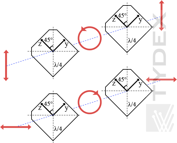 由雙折射材料制成的平平板用于改變輻射的偏振態(tài)。 波片通過移動波的兩個垂直偏振分量之間的相位來工作。 最常見的波片類型是半波片(λ/2 片)和四分之一波片(λ/4 片)。 λ/2 板給出相位延遲 π 和 λ/4 板 — π/2。 半波片改變線偏振光的偏振方向。 四分之一波片將線偏振光變?yōu)閳A形,反之亦然。 如果偏振方向沿波片軸之一,波片不會改變線偏振光束的偏振。
