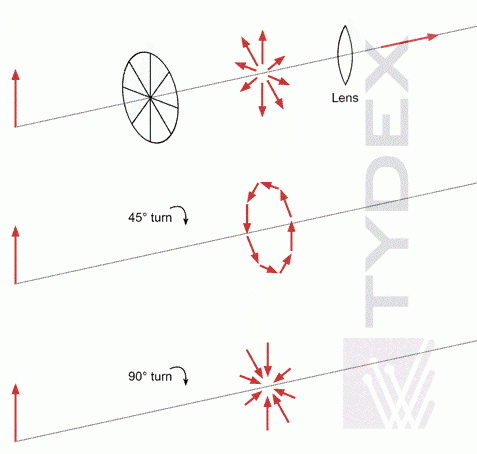 由幾個特殊定向的半波片組成的分段波片允許從線性偏振的輻射獲得徑向和方位角偏振的輻射。 這種波片的工作原理如下所示。